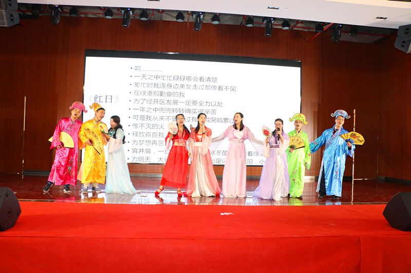 隨后,來自集團工程管理部林重胤以及嘉通公司潘青青甜蜜獻唱《告白氣球》,讓大家感受到了愛情的絲絲美好。嘉通公司的《夸夸咱公司》,用三句半的表演形式唱出了綠港集團濃濃的企業(yè)文化情愫,也展現(xiàn)了綠港員工積極、拼搏、向上的精神?!段乙鼐G港》、《聲臨其境》、《好運來》、《愛》、《好嗨喲》等多個節(jié)目在觀眾的熱情掌聲中聯(lián)袂奉上一場精彩演出,整個活動歌聲笑聲、熱烈的掌聲匯成了歡樂的海洋。集團營銷管理中心的《四小天王齊賀歲》以及集團計劃運營部、紀檢監(jiān)察審計部、安全監(jiān)督部聯(lián)合帶來的《蒙面唱將猜猜猜》將活動推向高潮,現(xiàn)場掌聲不斷。快板《綠港贊歌》道出了綠港集團成立五載,綠港人用智慧和汗水所取得的成效。最后,集團領導班子壓軸出場,帶來詩歌朗誦《相信未來》,贏得陣陣掌聲,讓大家堅定了信心、鼓足了干勁,對美好生活更加熱愛和向往。