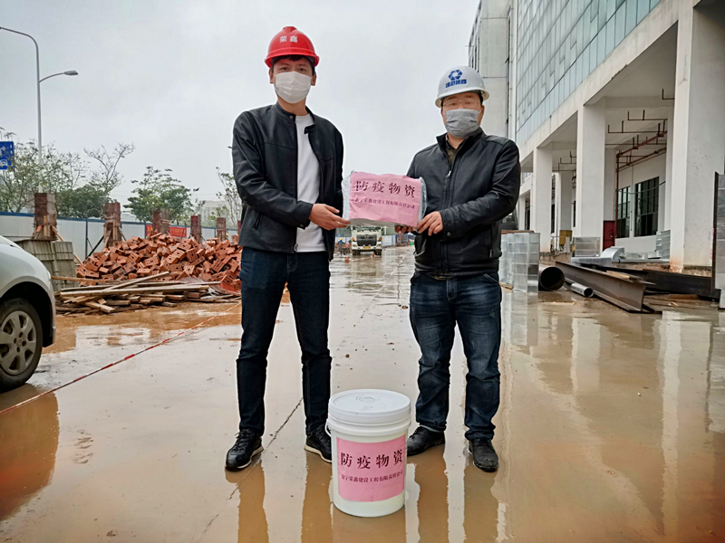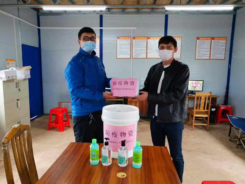 榮鑫公司副總經(jīng)理黎杰代表公司為項目現(xiàn)場送上防疫物資