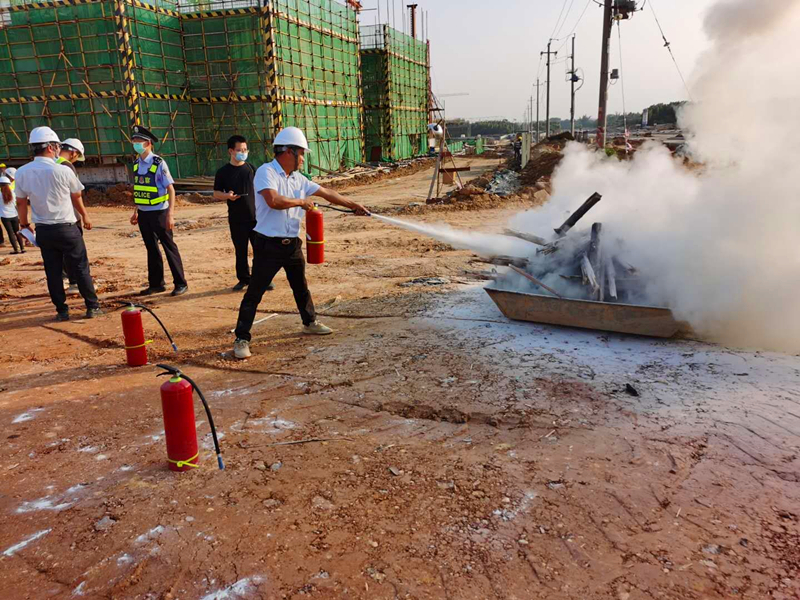 此次活動主要是模擬火災發(fā)生后的應急處置?;顒赢斕?,發(fā)現(xiàn)險情后,安全員立即上報,并進行控制和處理,并播報消防疏散通知。在總指揮的安排下,安全防護組、滅火行動組、疏散救援組、通訊聯(lián)絡組同時行動。安全防護組立刻關閉總電源閘門;滅火行動組拿取就近的消防器材進行滅火;疏散救援組迅速引領工人從安全通道撤離到安全地點;通信聯(lián)絡組將現(xiàn)場情況及時反饋給總指揮和現(xiàn)場指揮。待火勢完全撲滅,所有人員到達預定安全地點,通訊聯(lián)絡組認真清點人數(shù),確認無任何人員傷亡及財產(chǎn)損失。演練結束后,項目部組織滅火器的實操練習。施工人員按照講解的動作要領使用了滅火器,對布置的“起火點”進行有效撲救。